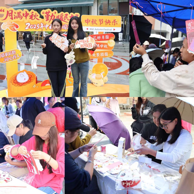 活动以线下互动体验形式开展,围绕“弘扬传统文化、搭建交流平台、彰显服务育人”目标,让师生在参与中感受节日氛围与文化温度。猜灯谜环节中,挂满灯谜的区域成为现场亮点,谜题涵盖中秋习俗、经典诗词及文化常识,同学们驻足思索、相互探讨,在趣味互动中激发了大家对传统文化的兴趣,提升同学们的文化自信;手工制作“兔子灯”环节里,西南民族大学后勤航标协会成员现场指导,提供全套制作材料,同学们通过动手裁剪、组装,亲手完成兔子灯,成为中秋的专属记忆,既传承了传统手工艺,也增强了文化认同感;“月宫萝卜保卫战”游戏环节则充满欢乐,同学们通过套圈获取萝卜道具兑换月饼钥匙扣、气球等小礼品,现场笑声不断,进一步营造了温馨热闹的节日氛围。