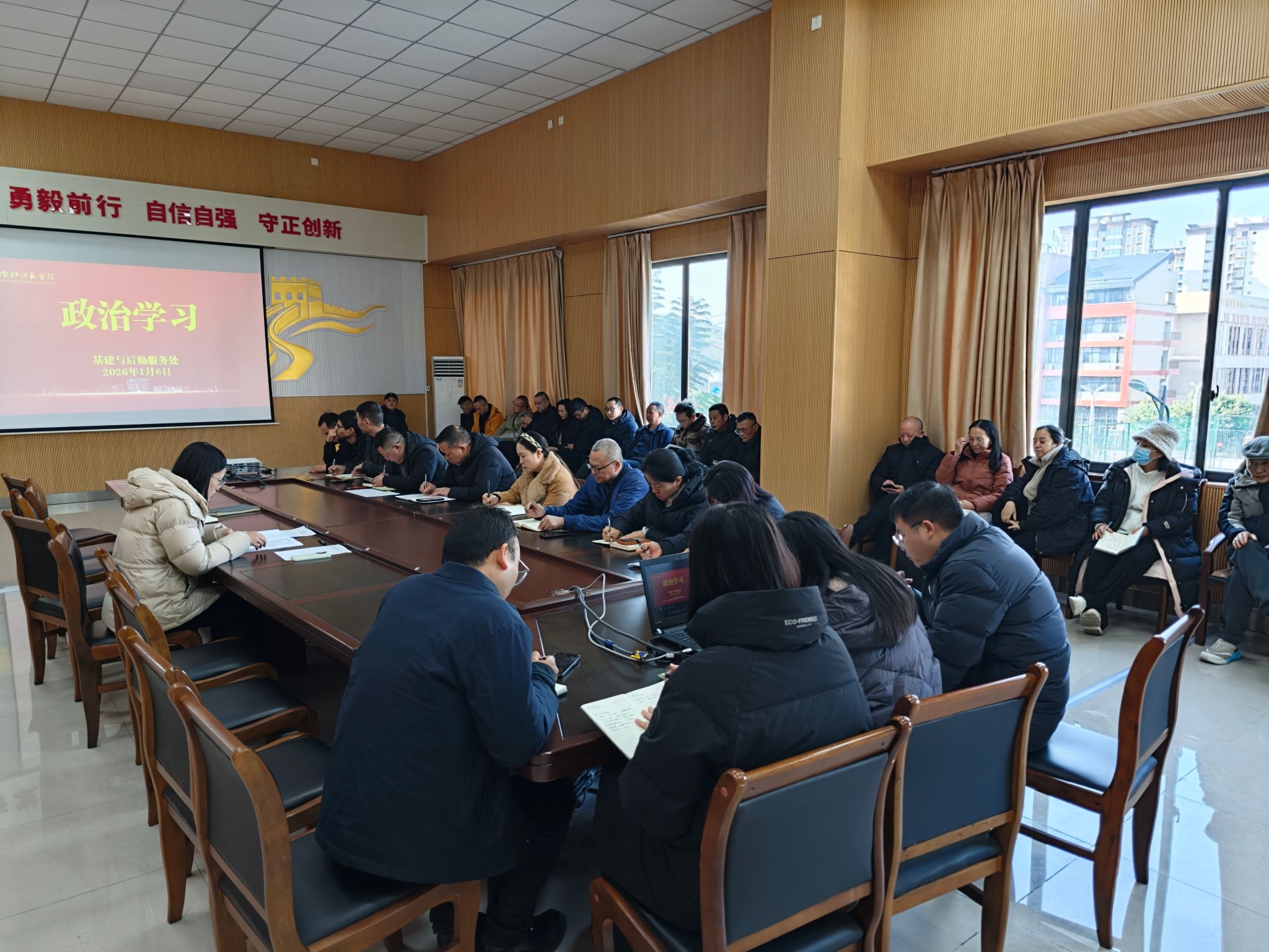 2026年1月6日,基建与后勤服务处在后勤服务中心204会议室组织召开政治理论学习会,学习习近平总书记近期重要讲话精神及中央、省委重要会议精神,并结合部门2026年重点工作计划,谋划新年工作新开局。会议由处长张莲莲主持,全体职工参加学习。